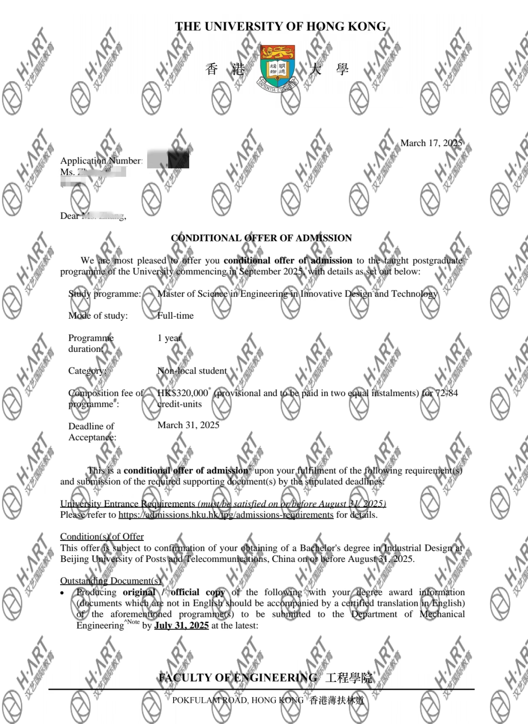汉艺24届学员 Z同学获 香港大学 创新设计与技术工程 MSc offer